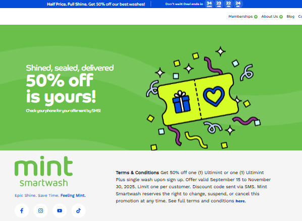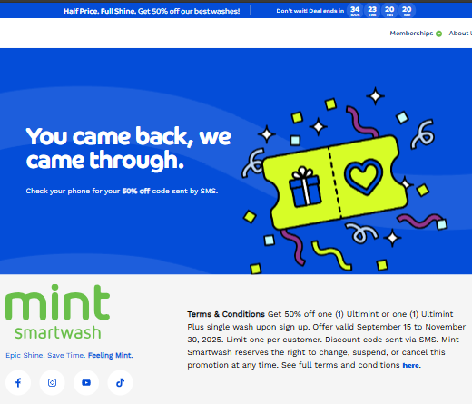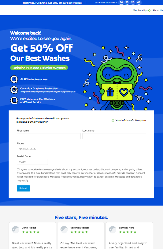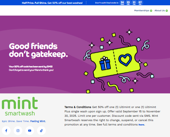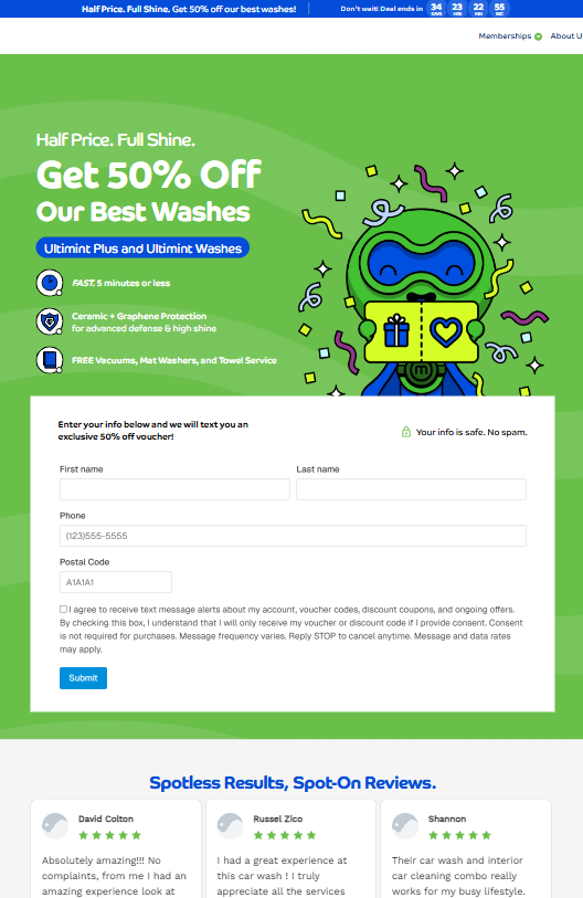 Each page’s form was integrated through an iFrame, connecting directly to the company’s Rinsed CRM software for data capture and lead management. Upon form submission, customers were redirected to a “Thank You” page and automatically sent their discount via text message.