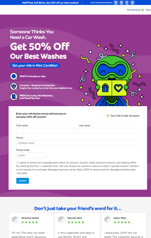 I developed a time-sensitive promotional landing page campaign for a car wash company, utilizing WordPress, Elementor, CSS, and JavaScript. The project included three distinct landing pages – targeted at new customers, returning customers, and referrals – each featuring design elements and copy to align with its audience.